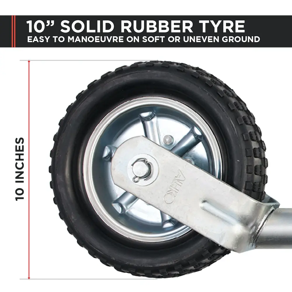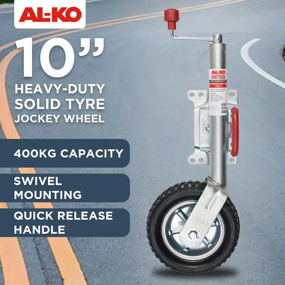 This jockey wheel has a 400kg static weight capacity and is ideal for heavy-duty use. It has a 250mm (10-inch) solid rubber tyre that can handle a variety of surfaces, including soft or uneven ground. The bolt-on swivel bracket allows for easy installation on your drawbar (U-bolts not included).