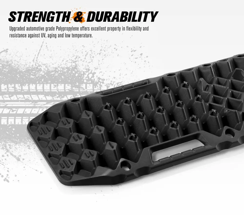 Forget your old-fashioned recovery tracks, this track by BUNKER INDUST, made of UV-stabilized automotive grade Polypropylene that can withstand up to 10 tons of weight, integrates interlocked diamond array construction that further enhances its flexibility. It can be safely bent to up to 150° without fracture! To further enhance its versatility, this track also has a jack base that is compatible with most farm jacks and ARB jack. And the cross-shaped teeth is strengthened to avoid melting against drastic wheel spin and well positioned for added traction and bite. In addition, the bottom of this recovery track not only inherits the same diamond array construction but also has the same function of the front. Be sure not to miss this creative device. FEATURES Highly Durable: Upgraded automotive grade Polypropylene offers excellent property in flexibility and resistance against UV, aging and low temperature. Ultra Flexibility: The interlocked diamond array aims to offer stronger flexibility,the track can be bent to up to 150° without fracture. Tougher But Lighter: Weighted only 5.92kg per pair, these BUNKER INDUST recovery tracks can withstand weight of up to 10 tons. Strengthened Teeth: The cross-shaped teeth, well positioned to bite the tyres to prevent vehicle from slipping back, will not melt against drastic wheel spin. Diamond Array Design: The interlocked diamond array aims to offer stronger flexibility—the track can be bent to up to 150° without fracture. Super Versatility: Compatible with most farm jacks and ARB jack, this recovery track is designed to help lift your vehicle in less ideal conditions. Double Capabilities: The bottom adopts the same construction of the top to provide a firmer grip of the ground and can also be used to get your vehicle unstuck. Upgraded Front Design: The interlocked diamond array offers superior debris and sludge facilitation ability, especially for the jack base in the center. Contour Ramp: Contoured to fit most tyres, the ramps are designed for an easier entering under the tyre and drive up, and can also be used as shovels. User Friendly Design: Ergonomic handles add comfort when using its end as a shovel and 10 keyholes allow convenient mounting. SPECIFICATIONS