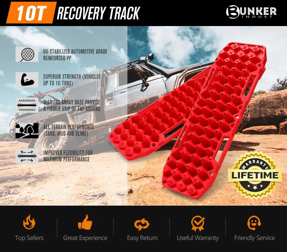 This recovery track brings the rugged UV-stabilized automotive grade Polypropylene and pairs it with strengthened teeth to improve durability and provide better bite to recover your 4×4 out of slippery mud, sand and snow. Each track can support up to 10 tons and offers excellent property in resistance against UV, aging and low temperature. Thanks to the interlocked diamond array construction, the recovery boards have an excellent mix of elasticity and rigidity to handle high levels of torque and flex during a recovery and make a 120°bend without fracture a possibility! It has a lower profile, and its bottom inherits the same profile of the top for double capabilities! FEATURES Greater Flexibility: Interlocked diamond array construction allows the recovery track to be bent to a maximum of 120°without fracture. Improved Formula: Upgraded automotive grade Polypropylene offers excellent property in flexibility and resistance against UV, aging and low temperature. Tough & Lightweight: Weighed only 4.36kg per pair, these BUNKER INDUST offroad recovery tracks can withstand weight of up to 10 tons. Strengthened Teeth: The cross-shaped teeth, well positioned to bite the tyres to prevent vehicle from slipping back, won’t melt against drastic wheel spin. Double Capabilities: The bottom adopts the same construction of the top to provide a firmer base against mud, sand and snow and can also be used for recovery. Upgraded Front Design: The interlocked diamond array facilitates debris and sludge faster. Contour Ramp: Contoured to fit most tyres, the ramps are designed for an easier entering and drive up, and can also be used as shovels. Low Profile Design: These BUNKER INDUST recovery boards can be better nested (9.5cm)and to save your precious in-vehicle spaces. User Friendly Design: Ergonomic handles add comfort when using its end as a shovel and 6 keyholes and 4 mounting holes allow for convenient mounting. Tough Leash: Neon orange nylon leash makes it a breeze to retrieve your recovery boards when the it is buried in the ground, and is highly visible against dark. SPECIFICATIONS