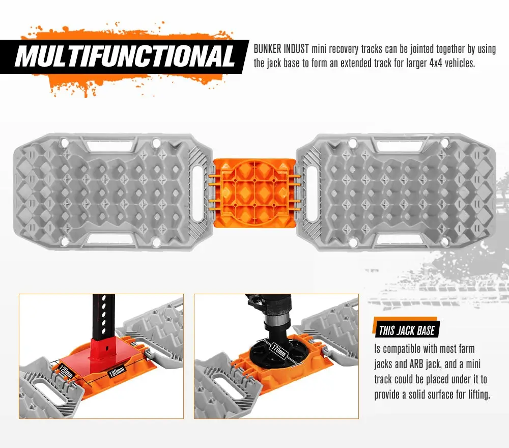 This off-road recovery kit comes with a pair of 15 Tons capacity unbreakable Recovery Tracks, 2 snatch straps which measure 8ft and 20 ft and have a width of 3 inches, that are made from Polyester with a breaking strength of 32,000LBS to recover most vehicles with ease! And 2 rust and corrosion resistant bow shackles promise 4.75 tons towing capacity, and UHMWPE made soft shackle delivers 11 tons breaking capacity without the fear of snapping. Leather gloves are essential when you’re working with a winch line, and the snatch block doubles the winch capacity and allows a more direct pull. The winch dampener suppresses excess stored energy build up on the winch rope, and you can fill the single inside pocket with extra weight if you want. Neon orange color and reflective strips give a visibility boost, and protective sleeves on the straps FEATURES Comprehensiveness: The BUNKER INDUST recovery kit is complete with everything: a pair of mini recovery tracks, a snatch strap, a pair of bow shackles, a hitch receiver and a hitch lock! Super Versatility: This jack base is compatible with most farm jacks and ARB jack, and a mini track could be placed under it to provide a solid surface for lifting. Tougher But Lighter: Weighed only 3.62kg, these BUNKER INDUST extraction devices can withstand weight of up to 15 tons. Strengthened Teeth: The cross-shaped teeth, well positioned to bite the tyres to prevent vehicle from slipping back, will not melt against drastic wheel spin. Dual Capabilities: The bottom adopts the same layout of the top to either provide a firmer grip of the ground,e.g. mud, snow or sand, or for vehicle recovery. Solid Snatch Strap: These Polyester snatch straps, which measure 8ft and 20ft, have a breaking strength of 32,000 lbs, and flat shape makes wrapping easier. Tougher Soft Shackle: This UHMWPE made shackle, with 11 tons breaking capacity, lets you pull large vehicles, without the fear of accidentally snapping it. Durable Snatch Block: This PVC coated device is designed with 8 ton capacity that can lessen the amount of pressure on your winch to extend its lifespan. Protective Gloves: Made of split cowhide leather, the thumbs and palms of the gloves are reinforced to protect your hands from abrasion and high temperature. Winch Dampener: It is designed to prevent rope recoil in the event of a rope failure to spare yourself from fatalities, and reflective strips enhance visibility. SPECIFICATIONS