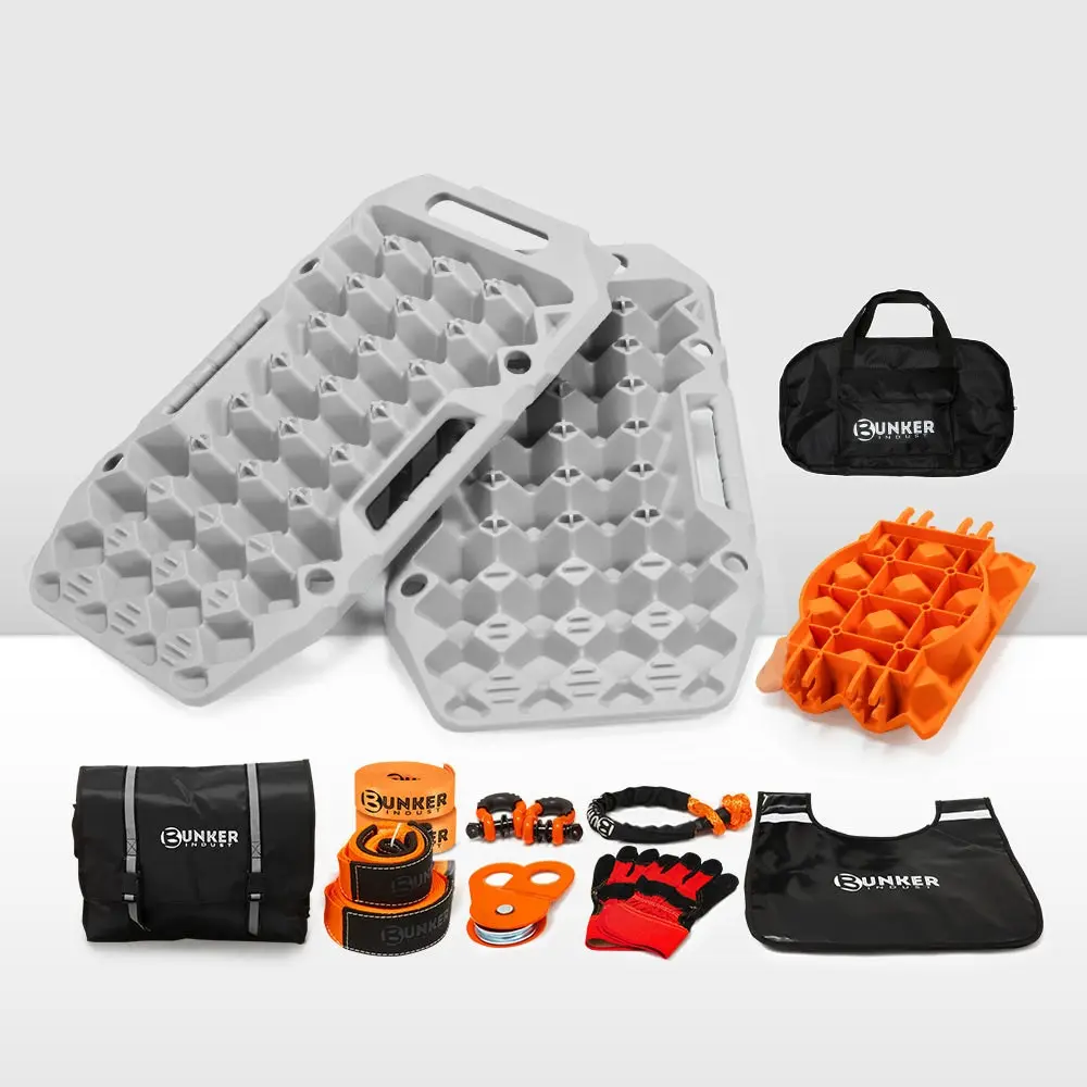 PACKAGE INCLUDES Pair BUNKER INDUST Recovery Boards (Grey) 1x 3”x 8FT Snatch Strap | 32,000LBS 1x 3”x 20FT Snatch Strap | 32,000LBS 1x Snatch Block | 8T 2x Bow Shackles | 4.75T each Pair Bow Shackle Isolators 1x Soft Shackle | 11T Pair Leather Recovery Gloves 1x Winch Dampener WARRANTY 2 Years Warranty
