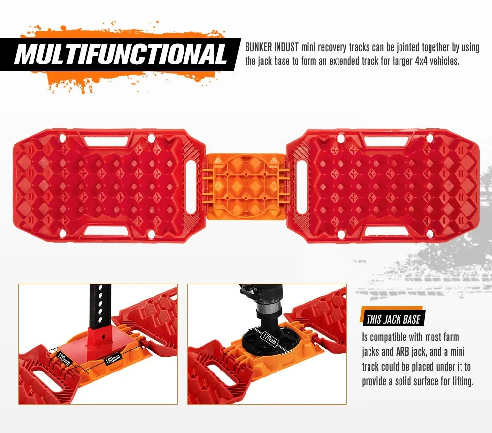 This off-road recovery kit comes with a pair of 15 Tons capacity unbreakable Recovery Tracks, 2 snatch straps which measure 8ft and 20 ft and have a width of 3 inches, that are made from Polyester with a breaking strength of 32,000LBS to recover most vehicles with ease! And 2 rust and corrosion resistant bow shackles promise 4.75 tons towing capacity, and UHMWPE made soft shackle delivers 11 tons breaking capacity without the fear of snapping. Leather gloves are essential when you’re working with a winch line, and the snatch block doubles the winch capacity and allows a more direct pull. The winch dampener suppresses excess stored energy build up on the winch rope, and you can fill the single inside pocket with extra weight if you want. Neon orange color and reflective strips give a visibility boost, and protective sleeves on the straps FEATURES Comprehensiveness: The BUNKER INDUST recovery kit is complete with everything: a pair of mini recovery tracks, a snatch strap, a pair of bow shackles, a hitch receiver and a hitch lock! Super Versatility: This jack base is compatible with most farm jacks and ARB jack, and a mini track could be placed under it to provide a solid surface for lifting. Tougher But Lighter: Weighed only 3.62kg, these BUNKER INDUST extraction devices can withstand weight of up to 15 tons. Strengthened Teeth: The cross-shaped teeth, well positioned to bite the tyres to prevent vehicle from slipping back, will not melt against drastic wheel spin. Dual Capabilities: The bottom adopts the same layout of the top to either provide a firmer grip of the ground,e.g. mud, snow or sand, or for vehicle recovery. Solid Snatch Strap: These Polyester snatch straps, which measure 8ft and 20ft, have a breaking strength of 32,000 lbs, and flat shape makes wrapping easier. Tougher Soft Shackle: This UHMWPE made shackle, with 11 tons breaking capacity, lets you pull large vehicles, without the fear of accidentally snapping it. Durable Snatch Block: This PVC coated device is designed with 8 ton capacity that can lessen the amount of pressure on your winch to extend its lifespan. Protective Gloves: Made of split cowhide leather, the thumbs and palms of the gloves are reinforced to protect your hands from abrasion and high temperature. Winch Dampener: It is designed to prevent rope recoil in the event of a rope failure to spare yourself from fatalities, and reflective strips enhance visibility. SPECIFICATIONS
