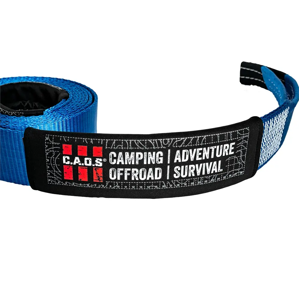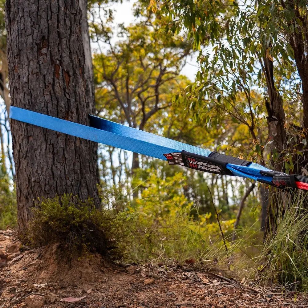 CAOS 10T Tree Saver / Winch Extension / Equalizer Strap 75mm x 5m (Blue) CAOS 10T Tree Saver, Winch Extension, Equalizer and Tow Strap – 75mm x 5m. NATA Laboratory tested and certified with 11,828kg break strength and triple reinforced loops. The CAOS Tow Strap has an Australian Legislation compliant label. 100% polyester, folded, stitched and with canvas encased reinforced loops. Comes with a heavy-duty protective carry bag and a wide Velcro tie which makes storing easier. CAOS 4X4 Recovery gear is a class above all else. NATA Certified with 11,828kg breaking strength – Tested Tough by Aussies for Aussies®. Features: