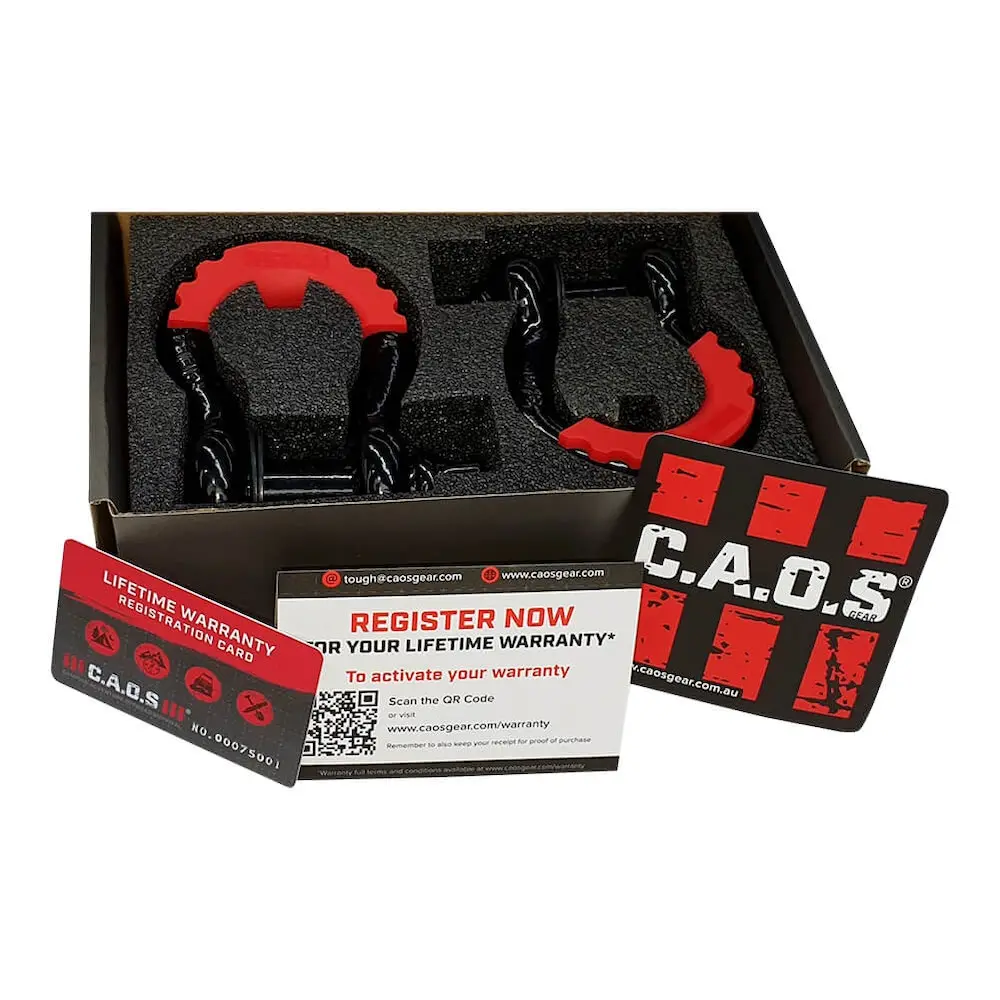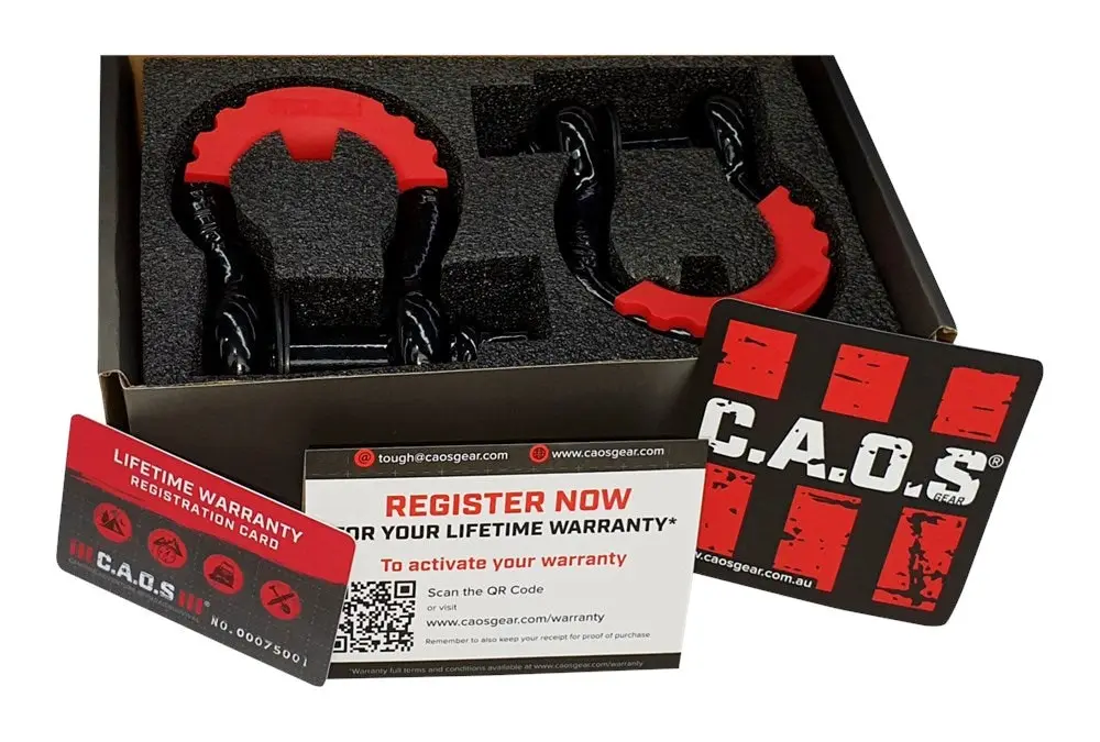 CAOS Bow Shackle 2 Pack. Heavy-duty and sturdy, these 19mm (3/4inch) Bow Shackles are rated to 4.75T WLL (working load limit) for towing and recovery. All CAOS Gear towing and recovery equipment is Tested Tough by Aussies for Aussies® and certified to have a breaking strength 270.5kN (27.5T). Certified Test #N056555. Manufactured from durable chromoly steel, finished with a 2 coat anti-rust process – electro-galvanized and then powder coated for ultimate protection. We don’t cut corners, but we do cut the middleman out. We provide quality products direct from the manufacturer to offer you great value for money. You can use CAOS products with confidence when towing or recovering your mates 4WD. Features: