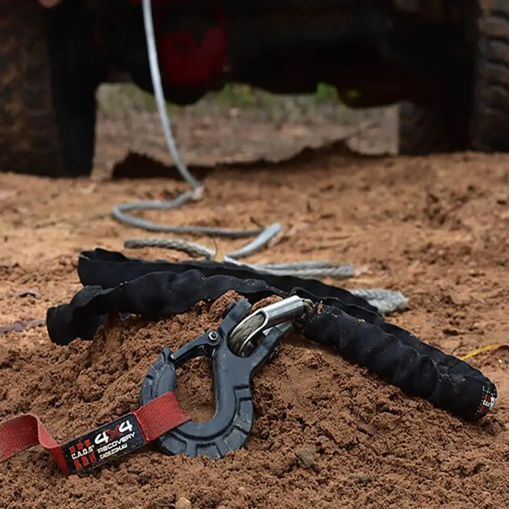 CAOS Winch Rope – 30m CAOS 30m 9,500kg rated Winch Rope with a 14,000kg rated connection hook and pull strap included. NATA Tested and Certified. Constructed using synthetic material close to one 10th the weight of a steel cable. The triple reinforced connection loops and two-stage rope protector (red) act as a guide for when you are getting close to the end. Features: