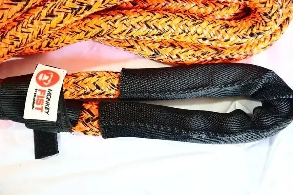 The Carbon Offroad Monkey Fist Kinetic Recovery Rope is a Nylon66(polyamide) double braided core and sheath rope with a specific gravity of 1.21. It is specifically treated with a special coating of the core fibre and sheath fibre which provides a 15% increase in abrasion resistance over similar ropes without the coating.
