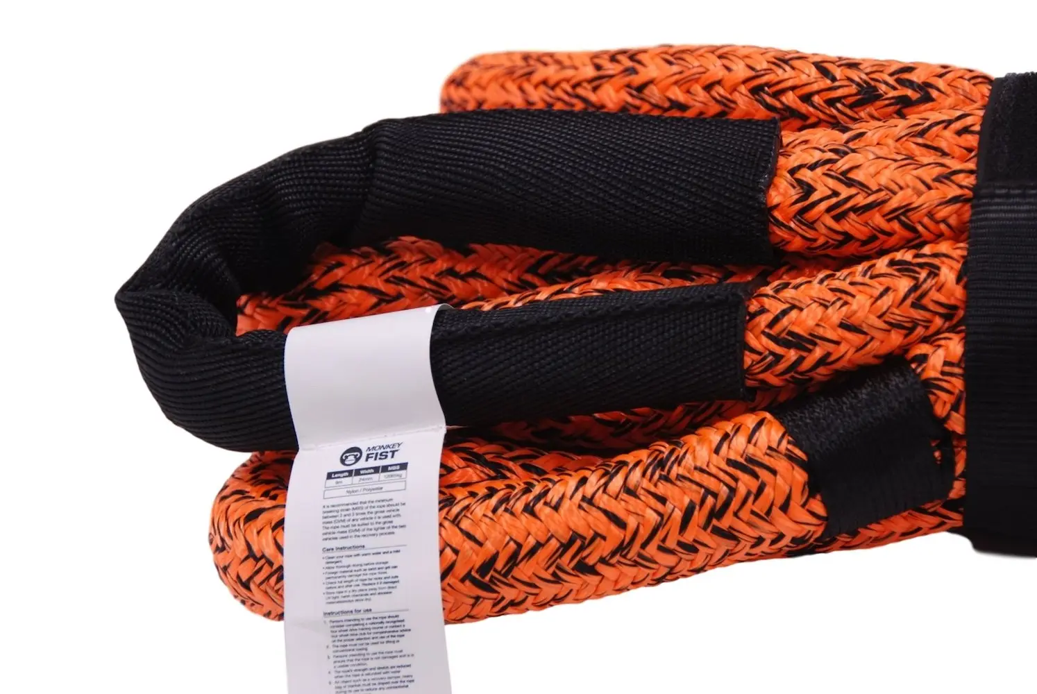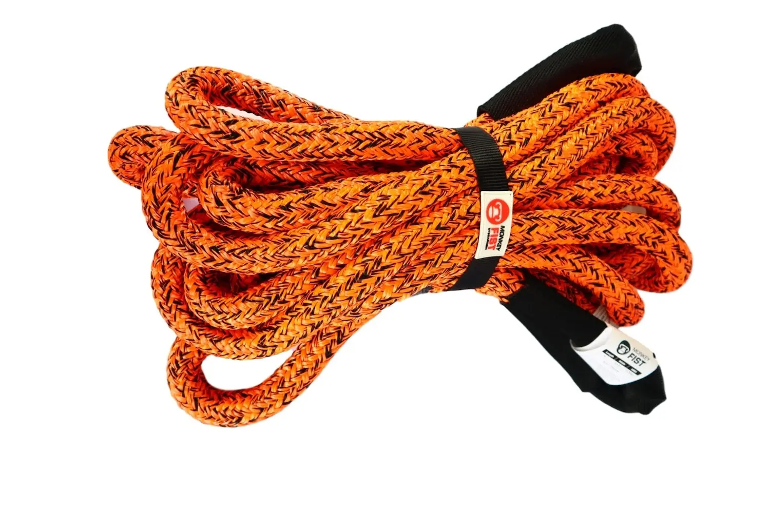 The Carbon Offroad Monkey Fist Kinetic Recovery Rope is a Nylon66(polyamide) double braided core and sheath rope with a specific gravity of 1.21. It is specifically treated with a special coating of the core fibre and sheath fibre which provides a 15% increase in abrasion resistance over similar ropes without the coating.