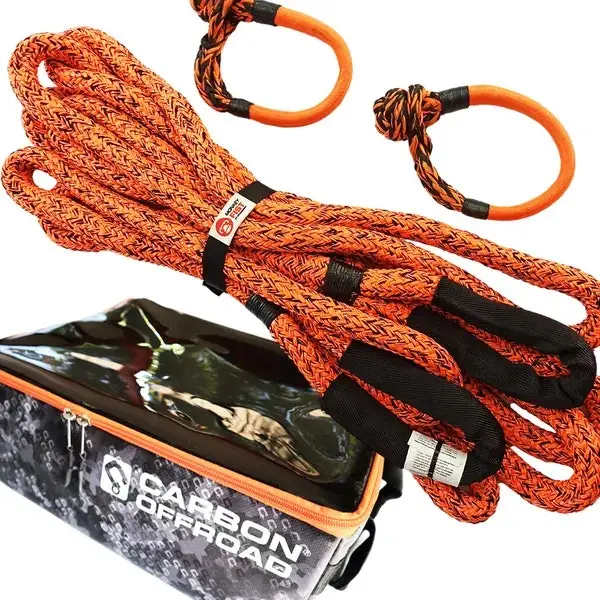 The Carbon Offroad Monkey Fist Kinetic Recovery Rope is a Nylon66(polyamide) double braided core and sheath rope with a specific gravity of 1.21. It is specifically treated with a special coating of the core fibre and sheath fibre which provides a 15% increase in abrasion resistance over similar ropes without the coating.