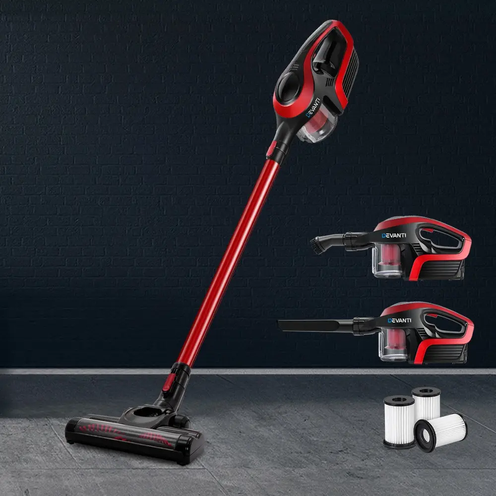 Our Devanti Handstick Vacuum Cleaner gives you the freedom to use it in any tight space or where spot cleaning needs to be done without lugging a big machine behind. Its powerful 150W 30000rpm motorised head has a steady suction power of up to 8000Pa. The 160 degree swivelling head can also be fitted with brush or crevice nozzles for different types of surface and zone cleaning that allows it to pick up dirt and debris easily. That makes the vacuum ideal for cleaning carpets, curtains, shelves, soft furnishings, vehicle interiors and delicate objects as well as vacuuming ceiling, corners, niches and gaps. The one-handed design is lightweight and bagless. All collected dirt and debris pass through a washable and reusable HEPA filter that eliminates up to 99.97% of dust and allergens. And it is also important to replace your HEPA filter in your vacuum cleaner periodically to ensure maximum efficiency. Three replacement filters are included with your purchase. Not least, the vacuum cleaner can work its magic for up to 25 minutes of continuous running time with the rechargeable 2000mAh lithium-ion battery. Features: Cordless and lightweight (2.5kg net weight) Long reach 2000mAH Li-ion battery 160 degree swivelling head Powerful motorised head with steady suction Suitable for carpet, rugs, hard flooring, upholstery and curtains Multifunction brush nozzle Crevice nozzle One-handed design to empty dust container Bagless with HEPA filter Washable and reusable HEPA filter (Comes with three replacement filters) Eliminates up to 99.97% of dust and allergens 25 minutes continuous running time Quick battery charging Specifications: Brand: Devanti Power: 150W Colour: Red and black Suction power: 8000Pa Motor rotate speed: 30000rpm Lithium battery capacity: 2000mAH Running time: 25 minutes Charging time: 5 hours Dustbin capacity: 0.5L Tube length: 62cm Adaptor cable length: 180cm Overall dimensions: 23cm x 19cm x 116cm Assembly required: Yes Number of packages: 2 Product Contents: Devanti Handstick Vacuum Cleaner x 1 Floor Brush x 1 Aluminium Tube x 1 Brush Nozzle x 1 Crevice Nozzle x 1 Nozzle Adaptor x 1 Rechargeable Battery x 1 Battery Charger x 1 Charger Adaptor x 1 Spare Filter x 3 User Manual x 1