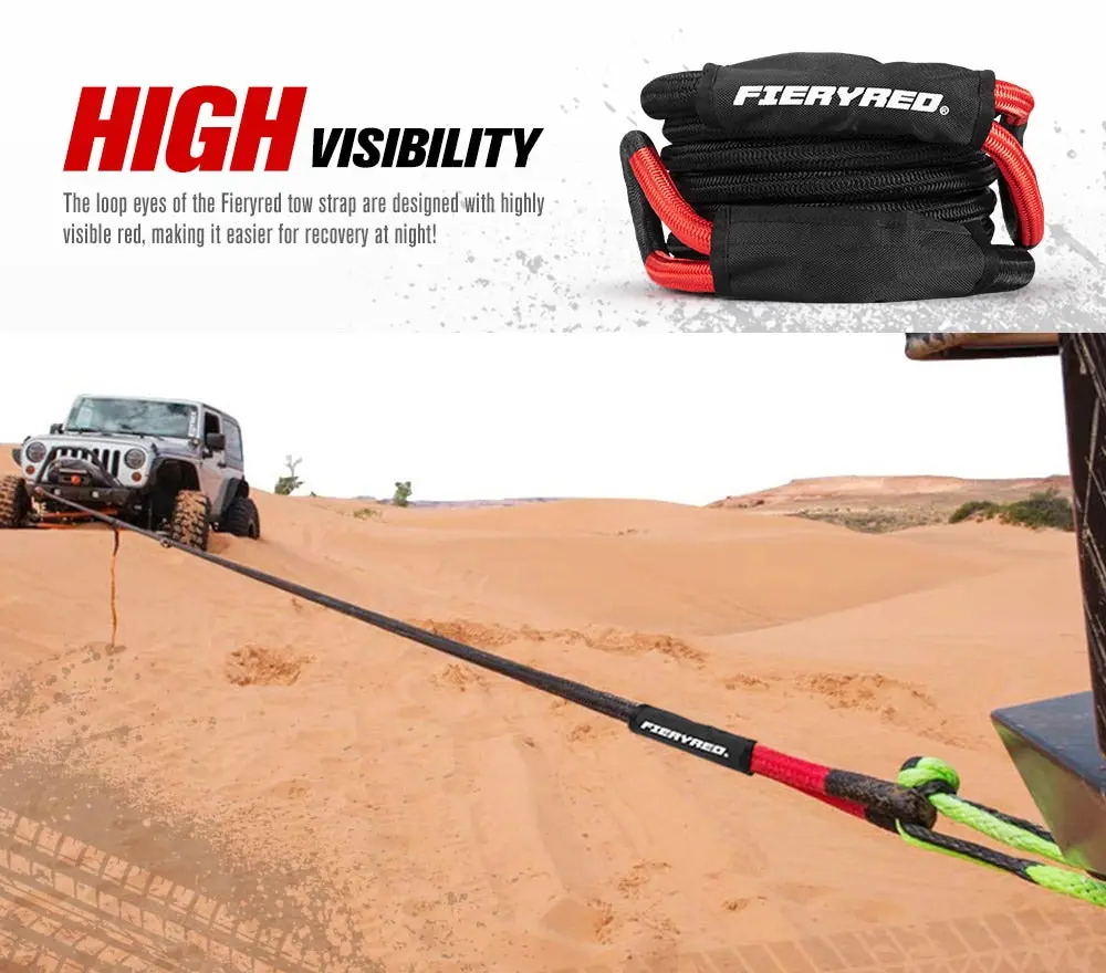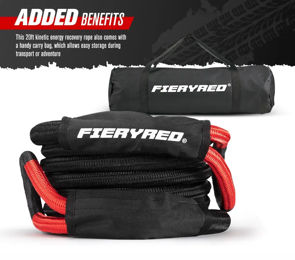 Made from double braided Nylon 66, a tensile and flexural semicrystalline, this 20ft Fieryred kinetic energy recovery rope is built with a working capacity of 18,700 lbs, which can easily pull on most 4x4s and Jeep you want without a second thought. Compared with snatch rope, this 20ft tow rope is highly tensile and can provide 30% additional stretch, which in turn translates into a higher pulling force to pull your stranded vehicle out of loose terrains, including snow, sand or mud, with minimum sudden shock! The outer layer of this tow strap is highly resistant to abrasives, oil and UV-based damage, which can effectively prolong the lifespan of the inner core, the loop eye is resin strengthened to deliver a stronger shackle grip, and tough stitched sleeves protect the weakest link of the spliced loop eye. Be sure not to miss it FEATURES Super Stretchability: Designed to deliver 30% additional ELONGATION, it can gain more momentum, generate higher pulling force and relieve the sudden shock. High Durability: Made from Nylon 66, a highly tensile and flexural semicrystalline, this 20ft recovery strap is built to get your job done in all conditions. Solid Construction: Made of 12 strand braided Nylon 66 core with 24 plaits Nylon 66 cover, this kinetic recovery rope has a working capacity of up to 18,700 lbs. Strengthened Protection: The outer layer of this recovery strap is highly resistant to abrasives and UV to effectively prolong the lifespan of the inner core. Optimized Design: Double braided nylon provides additional support, resin reinforced eye loops withstand high tensions and stitched sleeves protect weakest link. Multifunctional: This tow rope is applicable for heavy-duty operation and can be used as a recovery strap, a tow strap, a tree saver strap, or a winch extension strap. High Visibility: The loop eyes of the Fieryred tow strap are designed with highly visible red, making it easier for recovery at night! Added Benefits: This 20ft kinetic energy recovery rope also comes with a handy carry bag, which allows easy storage during transport or adventure. SPECIFICATIONS