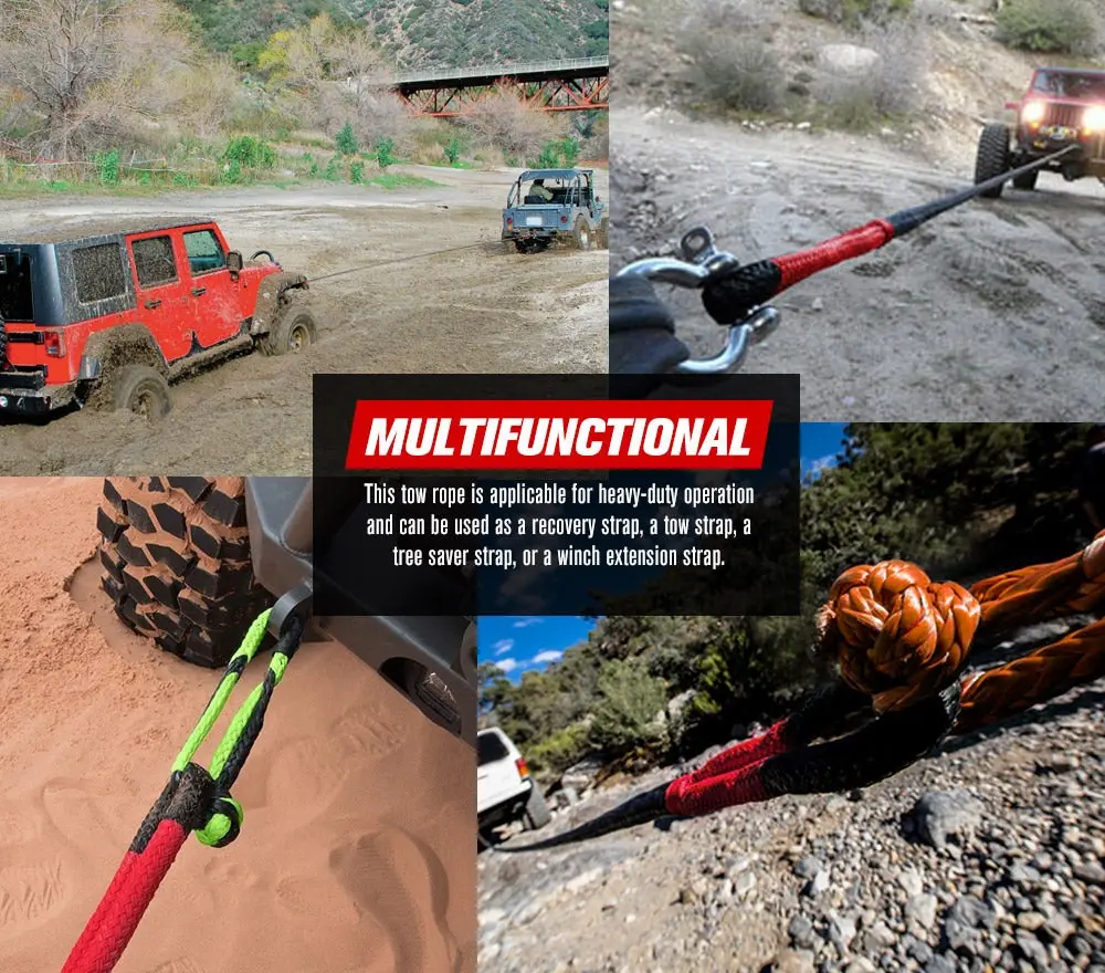 Made from double braided Nylon 66, a tensile and flexural semicrystalline, this 30ft Fieryred kinetic energy recovery rope is built with a working capacity of 18,700 lbs, which can easily pull on most most 4x4s and Jeep you want without a second thought. Compared with snatch rope, this 30ft tow rope is highly tensile and can provide 30% additional stretch, which in turn translates into a higher pulling force to pull your stranded vehicle out of loose terrains, including snow, sand or mud, with minimum sudden shock! The outer layer of this tow strap is highly resistant to abrasives, oil and UV-based damage, which can effectively prolong the lifespan of the inner core, the loop eye is resin strengthened to deliver a stronger shackle grip, and tough stitched sleeves protect the weakest link of the spliced loop eye. FEATURES Super Stretchability: Designed to deliver 30% additional ELONGATION, it can gain more momentum, generate higher pulling force and relieve the sudden shock. High Durability: Made from Nylon 66, a highly tensile and flexural semicrystalline, this 30ft recovery strap is built to get your job done in all conditions. Solid Construction: Made of 12 strand braided Nylon 66 core with 24 plaits Nylon 66 cover, this kinetic recovery rope has a working capacity of up to 18,700 lbs. Strengthened Protection: The outer layer of this recovery strap is highly resistant to abrasives and UV to effectively prolong the lifespan of the inner core. Optimized Design: Double braided nylon provides additional support, resin reinforced eye loops withstand high tensions and stitched sleeves protect weakest link. Multifunctional: This tow rope is applicable for heavy-duty operation and can be used as a recovery strap, a tow strap, a tree saver strap, or a winch extension strap. High Visibility: The loop eyes of the Fieryred tow strap are designed with highly visible red, making it easier for recovery at night! Added Benefits: This 30ft kinetic energy recovery rope also comes with a handy carry bag, which allows easy storage during transport or adventure. SPECIFICATIONS