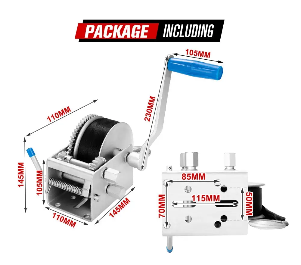 Equipped with 8m x 5cm webbing strap, the Fieryred boat winch features 3-speed (17:1 / 5:1 / 1:1) gear system which allows changing gears by moving the crank to different shafts. Set the hand winch up with pre-set mounting holes, and it is ready to pull cars, trailers, boats, etc. The hand winch has a handle with anti-slip handle grip for ergonomics. And the trailer winch features a ratchet pawl for free spool when unloaded, so you don’t have to unwind the strap slowly using the crank. With solid gear construction and precise gear tooth engagement, the Dacromet coated carbon steel boat winch gives unprecedented reliability & superior corrosion resistance in severe conditions. FEATURES Superior Capacity: Equipped with 8m x 5cm webbing strap, this Fieryred hand winch can handle pulling power of up to 3,000kg. 3-Speed Integral Gearing: This boat winch is engineered with a 3-speed (17:1 / 5:1 / 1:1) gear system that eases the process of pulling. Solid Gear Construction: This boat winch is engineered with solid gear construction and precise gear tooth engagement. Rust Resistant: This heavy-duty carbon steel hand winch is Dacromet coated to resist all weather conditions. Anti-Slip Handle: This hand winch comes with a handle with ergonomic handle grip. Smooth Operation: This trailer winch requires very low operator effort for easy operation. Free Spool Mechanism: This trailer winch comes with a ratchet pawl for free spool when unloaded. Secure Attachment: The clevis hook with safety latch provides an easy and secure attachment to the load. Easy to Mount: The pre-set mounting holes are strategically placed on the stable base to make it easy for you to install. Compact Design: This compact hand winch won’t take up much space and is ideal for pulling cars, trailers, boats, etc. SPECIFICATIONS