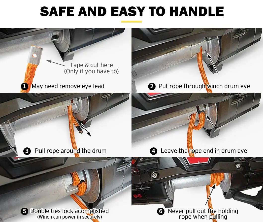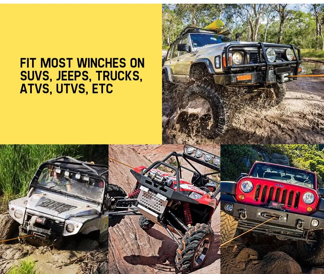DESCRIPTION Safety has been a major focus in the manufacturing of the Fieryred synthetic winch rope, the ultimate performance of which has earned a good praise among our customers. FEATURES High strength synthetic fiber, 10950kg Minimum breaking strength Lightweight,Only 1/8 the weight of steel winch rope in the same size Protective sheath protects against rough or sharp surfaces such as rocks Coated with urethane for increased UV.chemical resistance &Water resistant Low stretch with no recoil in unlikely event of breakage Fit most winches on SUVs, Jeeps, Trucks, ATVs, UTVs, etc. SPECIFICATIONS