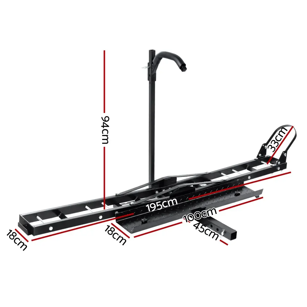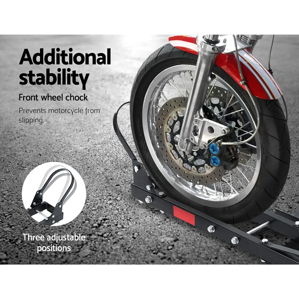 Transport your motorcycle with confidence with the Giantz Motorcycle Carrier. With its 2″ hitch mount, the carrier is compatible with most hitch receivers. Featuring heavy-duty steel construction, the carrier can carry up to 227kg (500lbs) with minimum hassle. It is also designed to enable steady and firm transport with a close-fitting front tyre channel, anti-tilt holder and front wheel chock. Both the tilt-holder and front wheel chock can be adjusted with three available positions. It also comes with four extra tie-down points to better hold the motorcycle firmly in place while on the move. The loading ramp also enables easy up and down and be used either side. Not least, the carrier can also be used for cars with their tyres backed up onto the carrier.