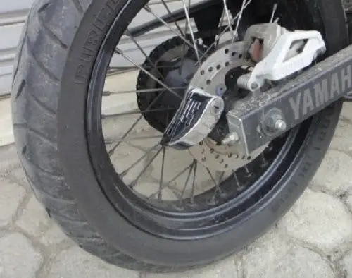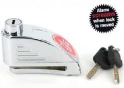 Disk lock with alarm for securing motorcycles and scooters from theft. Locks onto the disk brake and sounds an extremely loud alarm if an attempt is made to steal the bike.