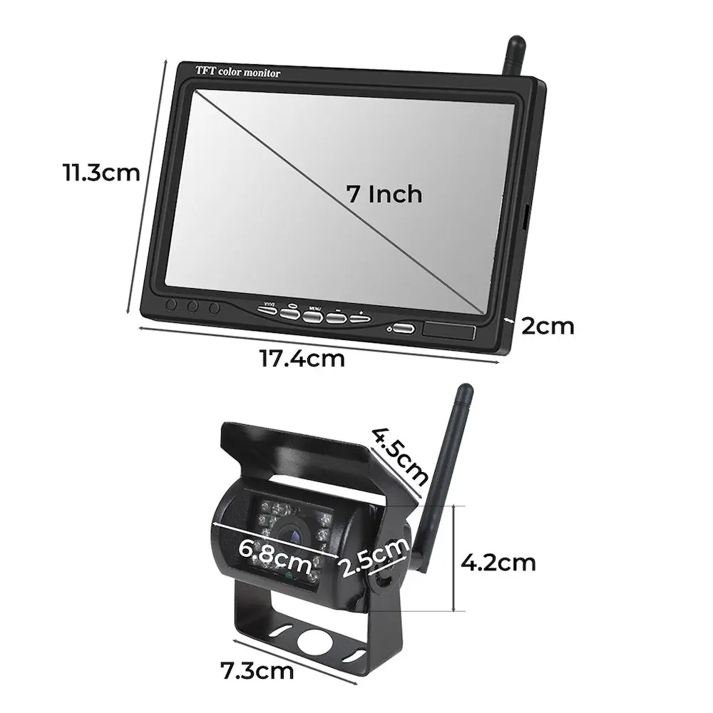 Turn on your reverse camera. Back out of your driveway with practised ease. Head off to the shops. Time to use your reverse camera again. How did you live before getting one? Cars can be replaced but what about children? Connect your wireless reversing camera. Avoid accidentally hitting any children that run behind you. Prevent collisions. Any confident person can install their reverse camera with screen. Just grab out your tools and screw or drill as needed. Save yourself the effort of paying a professional to do it. Enjoy the blessing of a rear view camera. Stop turning your head and putting pressure on your neck. Face forwards and reverse your car as you look into the rear view monitor. Positions your cameras to get the best view as you reverse. Watch the warning indicator lines so you don’t accidentally hit something. If in doubt you can always get out of your car to check for obstacles. Key Features Secure driving 7’’ HD TFT-LCD colour wireless monitor Optimal viewing angle All weather use – Wireless rear cameras Clear IR night vision Output to the screen or other devices such as DVD/GPS/camera Many uses Easy to mount SPECIFICATION: Wireless TFT LCD monitor Material: ABS plastic Screen size: 7 inch Screen ratio: 16:9 Resolution: 800 x 480px System: PAL/NTSC Voltage: 12v-24v DC Power: ≤8.64W Power Consumption: 5W 2-channel video input: V1/V2 auto switching Operating Frequency: 2390-2510 MHz / Standard: 2370Mhz Transmission distance: 10m Compression format: MPEG 4 video Transmit frequency: 18dBm Transmission speed: 12 Mbps FHSS: Frequency Hopping Spread Spectrum Hopping rate: 1200/S Operating temperature: -10°C to 65°C Dimensions: 17.4cm x 11.3cm x 2cm (L x H x W) Colour: Black Wireless rear camera Material: Powder coated steel Support: Standard NTSC 510 x 492 pixels / PAL 510 x 582 pixels Support: Colour CMOS image Horizontal resolution: 420 TVL Lens: 2.5mm Infrared light: 18pcs Night vision distance: 10 meters Waterproof: IP67 View angle: 120° Operating voltage: 12 / 24V DC Operating temperature: -20°C to 70°C Colour: Black PACKAGE CONTENT: 1 x 7’’ Monitor 1 x Monitor bracket 1 x Monitor visor 2 x Rear view camera 1 x Power cord 1 x 3M glue 3 x Lighter adapter 3 x Antenna 2 x Sets of Screws