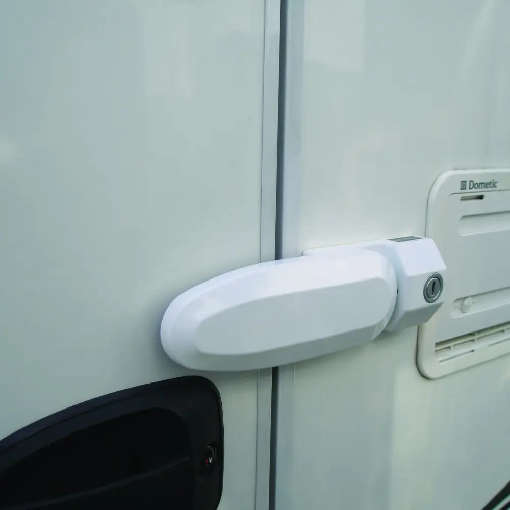 This new improved design only requires a 30mm gap between door frame and furniture at wall board level (handle only requires 50mm to turn.) Handle only projects 33mm away from the inner wall surface ensuring this lock now fits most caravans and Motorhomes in either portrait and Landscape positions requiring only minimal space for fitment.