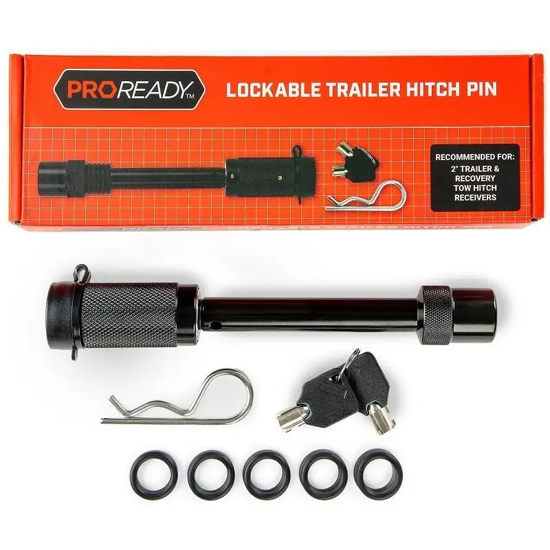 PROREADY Lockable Trailer Hitch Pin 16mm PROREADY Lockable Trailer Hitch 16mm Pin is fitted with a Rubber Cap for dust and sand and supplied with 2 keys to secure your towing hitch to your vehicle’s towbar. Simply remove the locking section from the lock by turning the key, slide the pin through both of the holes on the hitch and the towbar hitch receiver. Make sure it is all the way through, then place the locking section on the position and make sure it is correctly locked into place. Then place the rubber cap securely over the locking mechanism to prevent dirt and water entering the lock. Features: