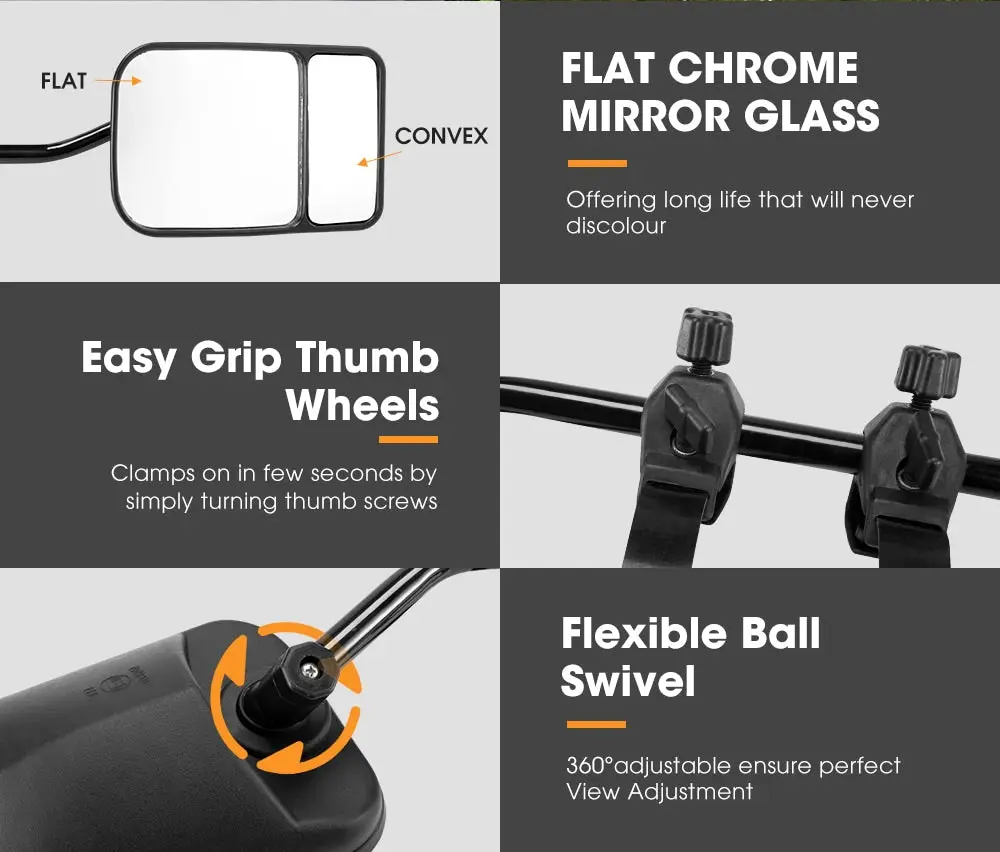 DESCRIPTION . FEATURES Ideal for 4×4’s, large and small cars with Unique Air Balanced Design to Stop Vibration Premium strap system ensures a secure fit. Mirror tension can be adjusted easily Stainless Steel Clamping Screws Stainless Steel Screws With Brass Inserts – Which will never Corrode Unbreakable glass fiber clamps Smooth rounded surfaces safe for pedestrians Designed in wind tunnel (Aerodynamic Head) – they become more stable the faster you go Minimal effect from passing road trains Flat Chrome Safety Glass SPECIFICATIONS