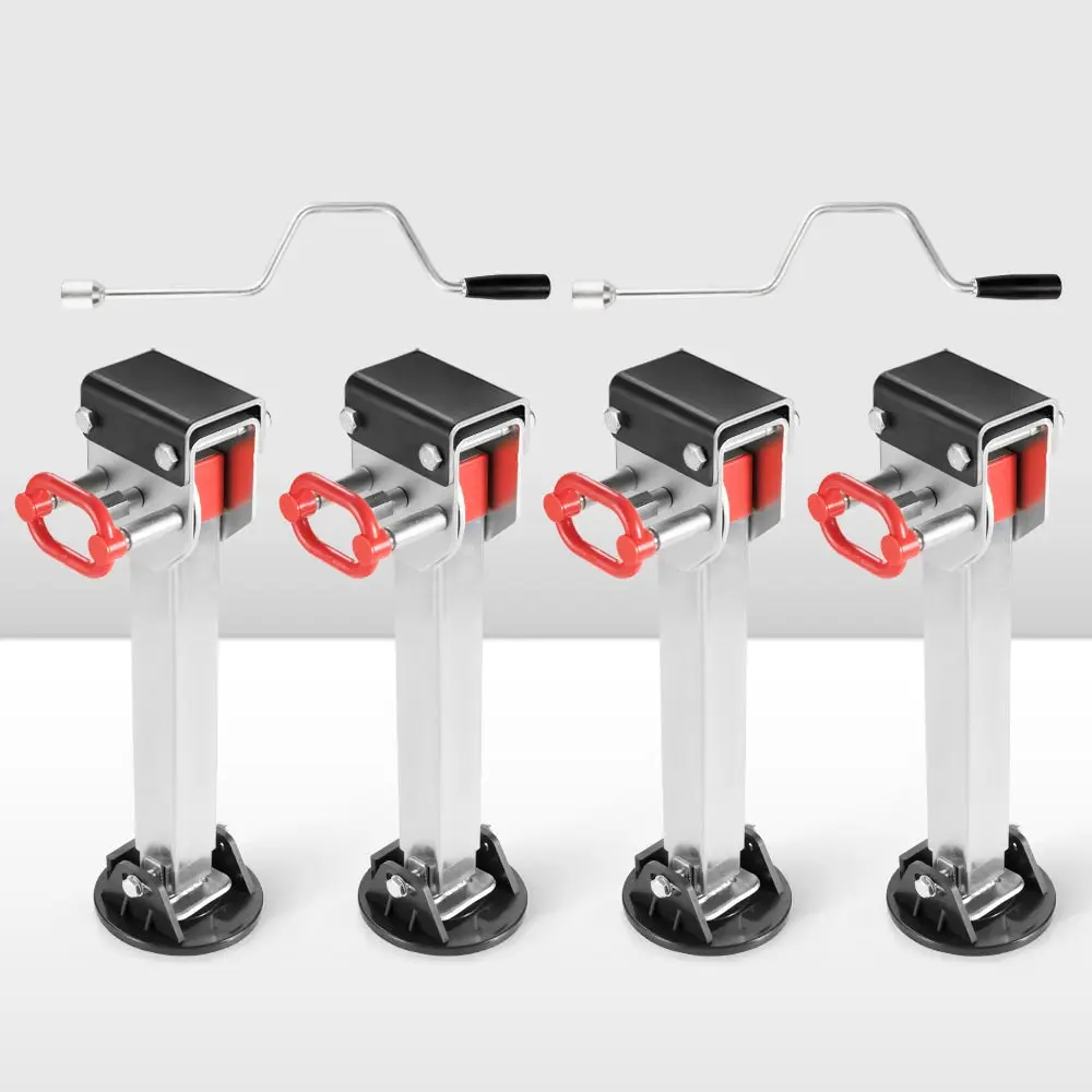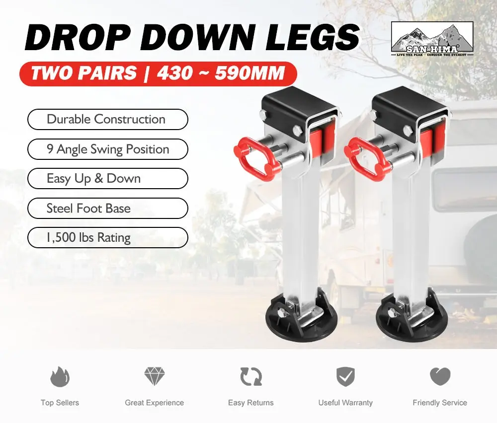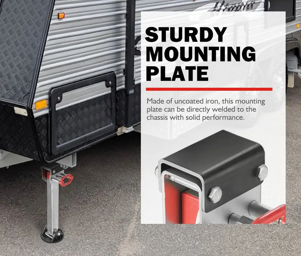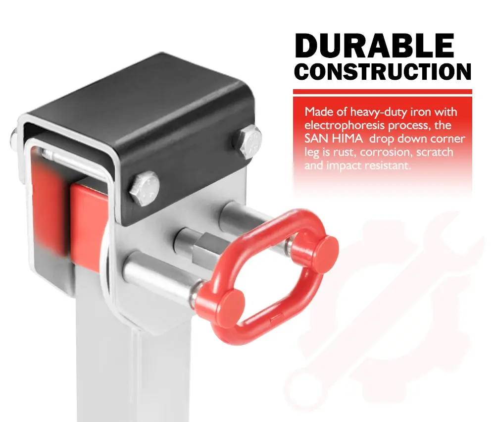 DESCRIPTION Spending holiday with your family is both stress relieving and relaxing, but how about your camper? It will rock on the strong wind especially when you are camping on an uneven ground. And this is where San Hima drop down corner leg comes into play. This drop down corner leg (1,500lbs capacity) is made of heavy-duty steel with electrophoresis, a process that equips this leg with superior rust, corrosion, scratch and impact resistant performance. So you can rest assured that it will accompany you for really a long time. To suit uneven ground, the base will offer your caravan a firmer base and can also achieve a 180° flip. In addition, the rotating plate can also be adjusted to 9 different angles to provide steady yet flexible support to your caravan. A hex drive is included to make the leg go “up” and “down” more convenient. And this device is ideal for trailer, caravan, camper trailer, boat trailer, motorcycle trailer, etc. Be sure not to miss it. FEATURES Durable Construction: Made of heavy-duty steel with electrophoresis process, the SAN HIMA drop down corner leg is rust, corrosion, scratch and impact resistant. Flexible Support: The rotating plate is designed to be rotated to 9 different angles to perfectly steady your caravan, caravan trailer, etc. Bigfoot Base: The heavy duty base designed to offer a firmer base against most terrains, can also achieve a 180° flip. Sturdy Mounting Plate: Made of uncoated iron, this mounting plate can be directly welded to the chassis. Easy Up & Down: With a hex drive included, this San Hima drop down corner leg can easily go up or down to the ideal position you want. Enhanced Capacity: The San Hima drop down corner leg is engineered to withstand up to 1,500 lbs of weight, which is sure to excel your demands. Comfortable Grip: The quick release handle is covered with a comfortable grip to protect your hands. Flexible Installation: The San Hima drop down corner leg can also be welded to the chassis with or without the mounting bracket. Super Versatility: The San Hima drop down corner leg is ideal for trailer, caravan, camper trailer, boat trailer, motorcycle trailer, etc. SPECIFICATIONS