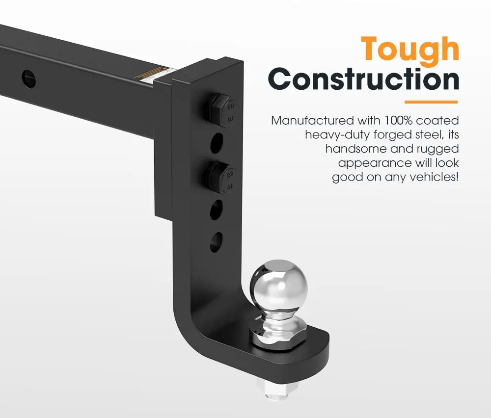 This San Hima adjustable towbar ball mount, made of 100% PVC coated heavy-duty forged steel that supports gross towing weights up to 6,000 lbs to carry varied loads as well as withstand the intrusion of rain, snow, dirt and mud, allows for incremental height adjustment with a maximum 192mm drop and a maximum 160mm rise to make sure that your attachment points are always kept level! And it will fit most vehicles with 2″ hitch receiver, including towing recreational, light-duty trailers, caravans and boat trailers, etc. To ensure peace of mind, this adjustable towbar ball mount also has a tubular lock to safeguard your belongings! And this precise engineered towbar ball mount can effectively resist chucking, rattling, shifting and vibration, securing a quieter and smoother ride! FEATURES Tough Construction: Manufactured with 100% coated heavy-duty forged steel, its handsome and rugged appearance will look good on any vehicles! Vicious Tow Capacity: This adjustable towbar ball mount by SAN HIMA supports gross towing weights up to 6,000 lbs to carry varied loads. Adjustable Design: It lets the ball mount adjust up to a Max. 192mm drop and a Max. 160mm rise, meaning your attachment points are always kept level. Universal Compatibility: This adjustable towbar ball mount by SAN HIMA is a versatile piece of work that will easily fit any vehicle or trailer with a 2″ mount. Weather Resistant: The towbar is PVC painted to resist rain, snow, dirt and mud and the lock and hitch ball is protected with a corrosion-resistant chrome plating. Anti-Theft Mechanism: This San Hima adjustable towbar ball mount integrates a tubular lock that can effectively prevent any picking and prying. Optimized Design: The thread on the strengthened screw is super sturdy and won’t wear off or got wrecked against harsh use. Peace of Mind: Precise construction resists chucking, rattling, shifting and vibration, and a spare key ensures the absent minded are covered! Added Benefits: Two protective caps are included to keep the hitch ball and lock from potential hazards, scratch, rust and abrasion. Fits 2″ standard square towbar, please check your towbar! SPECIFICATIONS