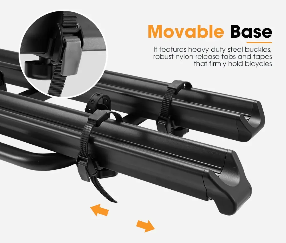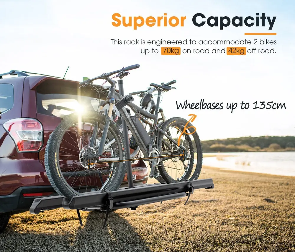 Fortunately, bike rack options for electric bikes do exist. Made of heavy duty steel and aluminum with e-coating for years of reliable use, this 2’’ e-bike rack can accommodate 2 bikes up to 154lbs (70kg) on road and 92lbs (42kg) off road. Security is another advantage as the rack comes with heavy duty steel buckles, robust nylon release tabs & tapes and adjustable ABS clamps that firmly hold bicycles. This San Hima electric bike rack for car has exclusively designed ramps which can be pulled out from trays for loading and pushed back for storage and are made of one-piece aluminum for durability. No more breaking your back lifting heavy e-bikes but much more effortlessly rolling your e-bikes up the rack. FEATURES This e-bike rack accommodates tires up to 3.35’’ (8.5cm) wide and bike wheelbases up to 53.15’’ (135cm). Hassle-Free Ramps: With ramp knobs, the exclusively designed ramps can be pulled out from trays for easy roll-on loading and pushed back when not in use. Adjustable Trays: Trays can be wholly reversed to set up ramps and roll your e-bikes from either left or right, and are adjustable to eliminate bike to bike contact. Superior Capacity: This San Hima electric bicycle rack is engineered to accommodate 2 bikes up to 154lbs (70kg) on road and 92lbs (42kg) off road. Utmost Security: It features heavy duty steel buckles, robust nylon release tabs & tapes and adjustable ABS clamps that firmly hold bicycles for utmost security. Protective Design: Clamps come with TPR pads which not only tighten the clamps but also protect electric bicycles from scratches. Easy Installation: This rack can be easily installed into a 2’’ hitch receiver except for 4×4 with a rear mounted spare tire which requires a hitch extension. Perfect Compatibility: Thanks to adjustable stabilizers & clamps, this fat tire e-bike rack can carry e-bikes, mountain, road, women’s specific & kids bikes. Tilt-Down Design: This San Hima electric bike rack for car can be tilted down with e-bikes loaded for trunk access. Durable Construction: Made of heavy duty steel and aluminum with e-coating, this electric bike rack is designed to resist corrosion for years of reliable use. SPECIFICATIONS