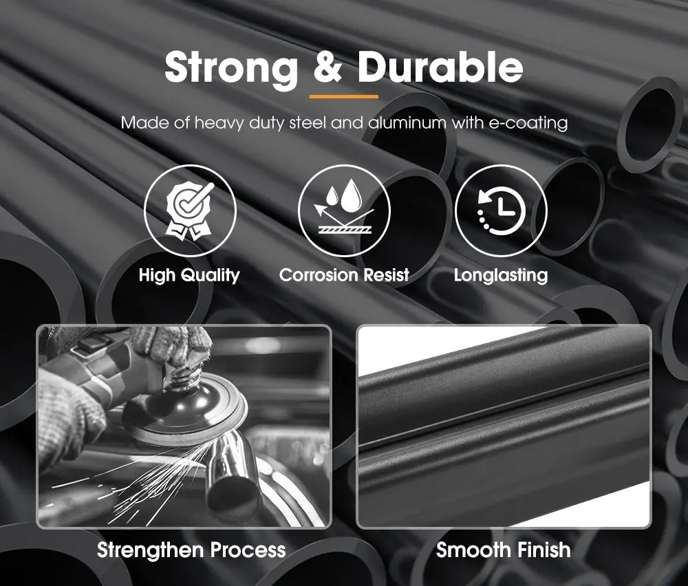 Steel frame with e-coating, aluminum trays & ramps with e-coating, ABS clamps with TPR pads, nylon tapes with steel buckles & nylon release tabs, PP knobs
