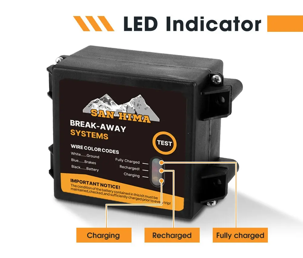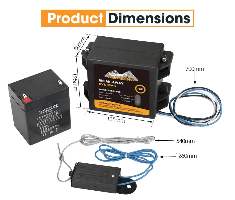 This SAN HIMA break away system for trailers, for use on 1 or 2 axle caravans and trailers equipped with electric brakes, can activate trailer brakes upon separation from vehicle. The trailer break away system features a 12V 5Ah battery with built in battery charger that can be charged from tow vehicle or from house battery of trailer. It’s important for you to note that anytime the pin is removed from the switch the battery life will begin to deplete, so always be sure your battery is fully charged before each tow. This break away system for trailers is designed with a push to test button so you can easily know the level of charge of the battery. FEATURES Quick Activation: This SAN HIMA break away system for trailers activates trailer brakes upon separation from vehicle. Wide Application: This break away system for trailers is for use on 1 or 2 axle caravans and trailers equipped with electric brakes. Legal Compliance: This break away system makes your trailer over 2,000kg (4,409lbs) gross trailer mass conform to the legal requirement in Australia. Convenient Charging: The 12V 5Ah battery with built in battery charger can be charged from tow vehicle or from house battery of trailer. Push to Test: The easy to operate button is used to indicate the level of charge with LED indicator. Tough Construction: The break away system for trailers features heavy-duty PP case which protects battery from moisture and debris. Hassle Free Wiring: The trailer break away system comes with pre-wired, colour-coded cables for battery (black), brakes (blue) and ground (white). Easy to Install: The battery box and the switch can be quickly and easily installed with screws or rivets. SPECIFICATIONS