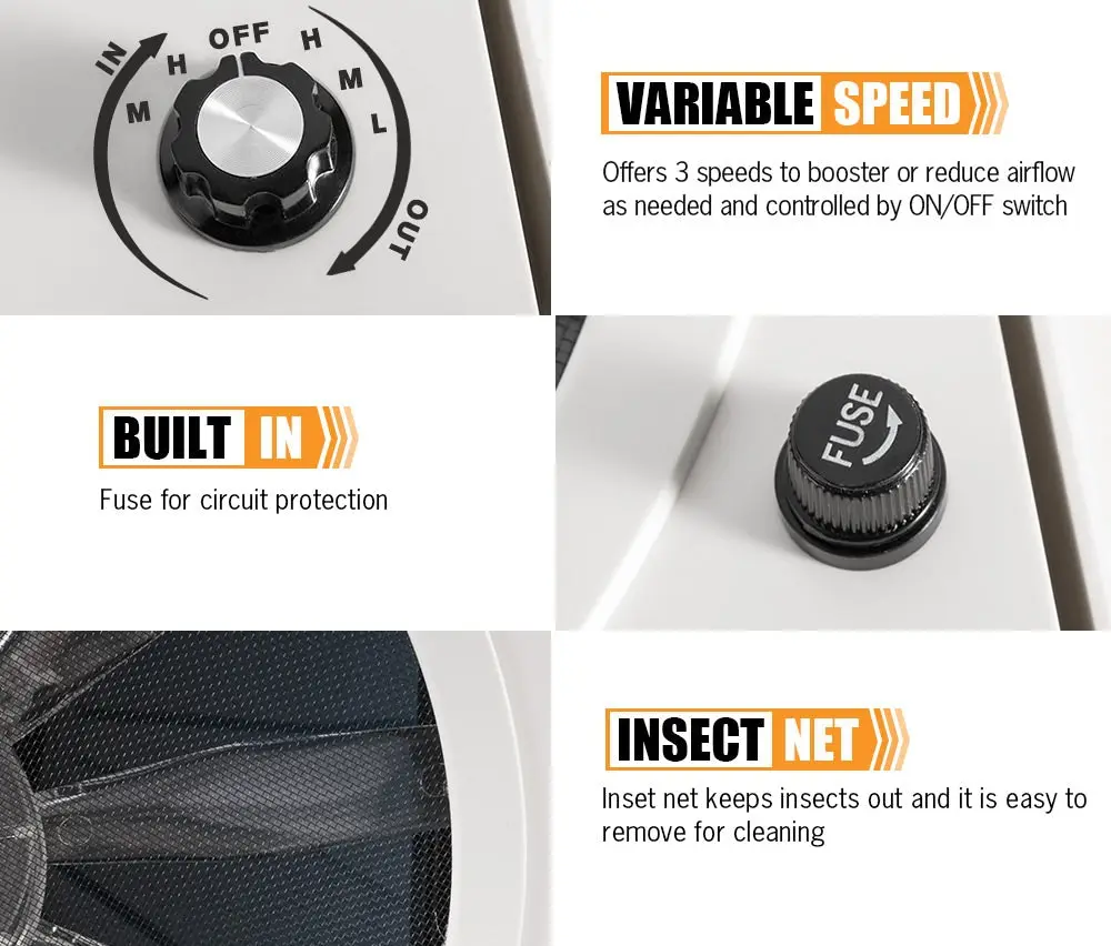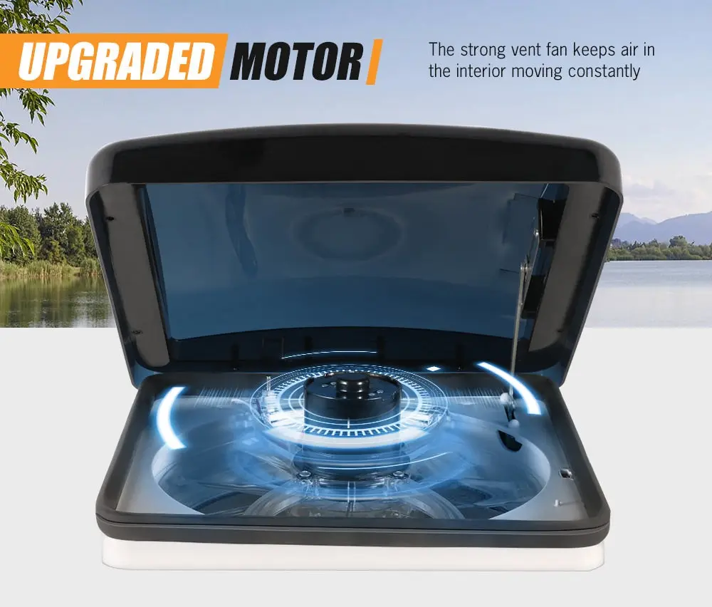 DESCRIPTION . FEATURES Heavy Dduty strong smoked roof,UV-ray Resistant High speed 1200 revolutions per minute Screen frame has radius corners and consists of two removable pieces 3 fan speeds reversible airflow design Built in fuse for circuit protection Fits standard 14″ x 14″opening for easy installation 12V fan controlled by on/off switch fitted to vent Manual lift lid design 4A fuse protection SPECIFICATIONS