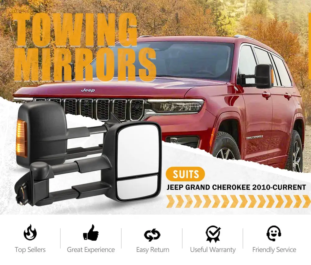 DESCRIPTION Towing a caravan or a camper trailer can be challenging. For reversing or turning, seeing past the trailer’s sides is critical for towing safely. If your Jeep Grand Cherokee 2010-Current didn’t come with rear view mirror/side mirror, the extendable side towing mirror will provide the extra vision you need.