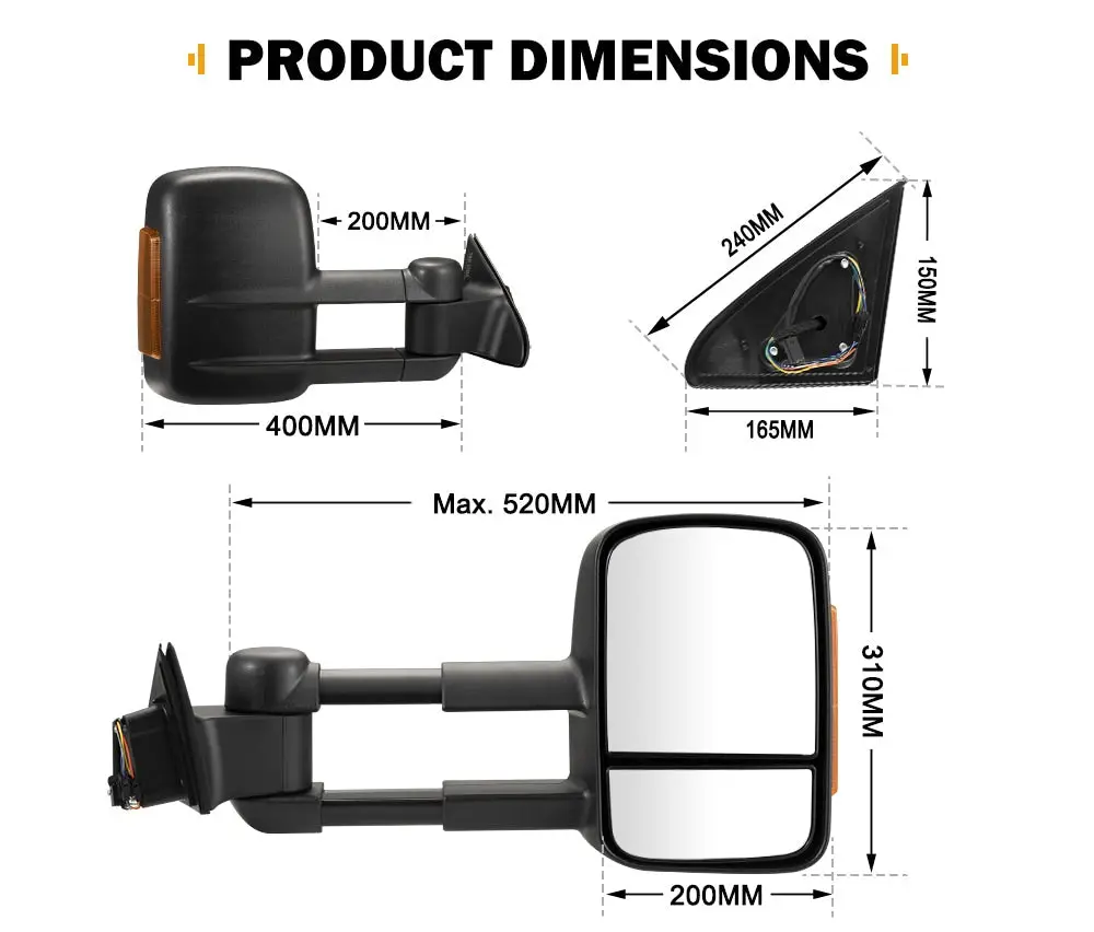 This car mirror, equipped with LED turn signals, is a perfect fitment for quick installation. Two types of mirrors are incorporated to provide crucial visuals for your driving safety. The larger electric flat mirror provides clear vision down the side of your camper or caravan. The lower convex mirror eliminates blind spots and provides a better vision within the lanes near your vehicle. Made of ABS housing and aluminum base, this towing mirror is equipped with all-weather performance against harsh road conditions. Once fitted this rear view mirror will extend an additional 105mm and a total of 520mm outward from your car door, extending the vision range to keep you safe. FEATURES Perfect Fitment: This pair of car mirrors is precisely engineered to serve as a direct replacement for Jeep Grand Cherokee 2010-Current. Hassle Free Installation: This extendable towing mirror offered by us is supplied with complete instructions for quick installation. Dual Mirror System: The convex mirror is curved for a wider view to eliminate blind spots, and the flat mirror provides an unobstructed view of the rear. Adjust Electrically: The larger flat mirror is capable of being shifted with the flick of a switch from your existing control panel while towing a caravan or a trailer. Adjustable Design: The side mirror and its convex mirror can be manually adjusted: folded inwards to prevent potential damage or adjusted to the blind spots. Extendable Construction: It slides out an additional 105mm and extends a total of 520mm outward from your car door, extending the vision to keep you safe. Larger & Safer: Our extendable side towing mirror is substantially larger than your stock mirror, giving you more vision to spot potential hazards. LED Turn Signals: For a safer drive, these towing mirrors come with LED turn signals to alert others on the road if you are about to change lanes or turn. Solid Build: Made of ABS housing and aluminum base, this towing mirror is impact and scratch resistant and easily handles vibration on the bumpy road. Modern Look: Unlike traditional extendable towing mirrors, this extendable towing mirror will let your 4×4 stand out in the crowd. SPECIFICATIONS
