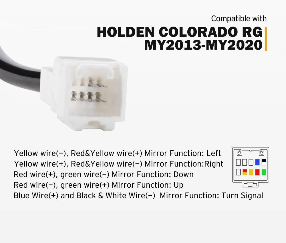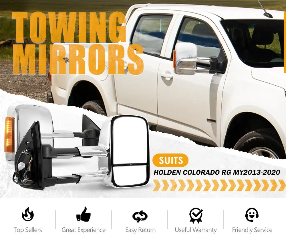 DESCRIPTION The consrtuction of the factory mirror sometimes does not take towing into consideration,and driver’s vision will,to a great extent,be blocked by the caravan at the rear.And this pair of towing mirror is our offering to your pains. The mirrors come as full replacements, and are supplied with plug and play wires for quick installation. We also incorporates two different surfaces to provide different but crucial visuals for your driving safety. The flat mirror is meant for regular driving, and the convex mirror, which is for broader vision to eliminate spots, allows you to have a clear view to the lanes. The mirror has an extension of 100mm, and can slide out a further 100mm when towing. It can also be adjusted to areas of concern, or folded to avoid potential damage. Made of ultra tough ABS, this mirror is therefore equipped with all-weather performance, and is fearless against any harsh road conditions.Chrome finish is n FEATURES OEM Fitment: This pair of towing mirror is precisely engineered for Holden Colorado RG MY2013-MY2020. Plug & Play: This towing mirror offered by us is supplied with plug and play wires for quick and easy installation. Solid Build: Made of sturdy ABS with chrome finish, the mirror is engineered for toughness to withstand any road conditions and harsh weather. Extendable Construction: Extendable construction guarantees this mirror a total of 200mm of wider extension compared with factory ones. Easy Adjustment: It can also be adjusted to the areas of blind spots, or manually folded inwards to prevent potential damage. Flat Mirror: It can provide driver an unobstructed view of the rear of the vehicle, both horizontally and vertically. Convex Mirror: It features a convex shape for enormous vision to eliminate blind spot, and can be adjusted manually. Less Distortion: The balanced design of the mirror aims to eliminate the distortion of the rear view. *NOTE: Indicators are required to be in Mirrors by law if you have pre-existing indicators in your OEM mirror. Minor adjustment is needed if OEMs don’t come with indicators. SPECIFICATIONS