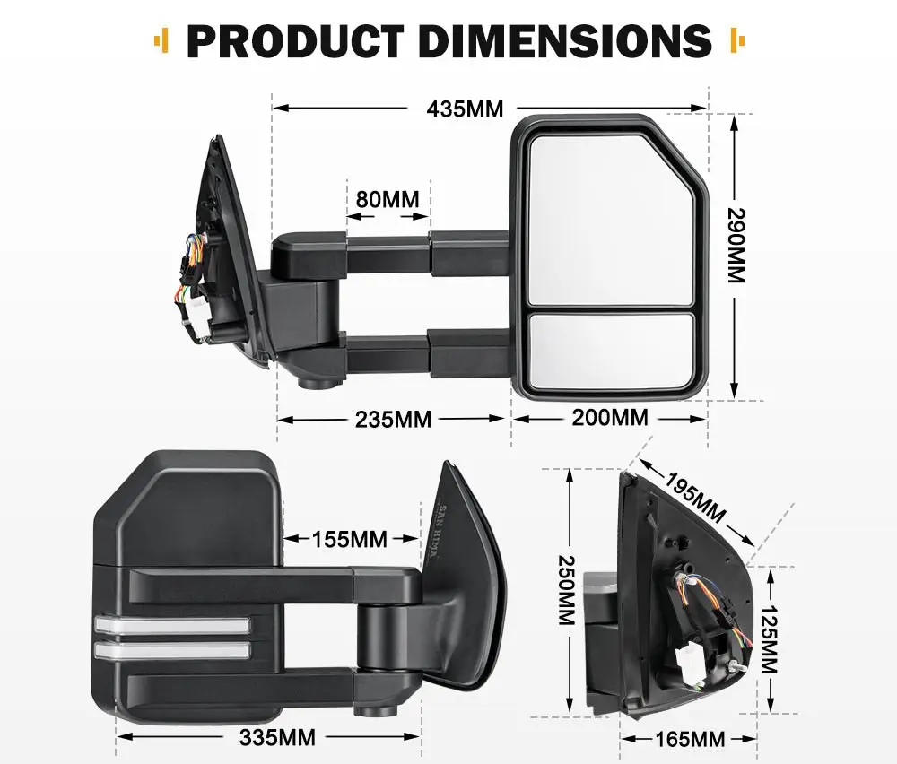 The construction of the factory mirror sometimes does not take towing into consideration, and the driver’s vision will be largely blocked by the caravan at the rear. This extendable side towing mirror comes as full replacements with plug & play wires and nuts for quick installation. The flat mirror is fully electric for regular driving, and the convex mirror allows a broader vision. Dynamic indicator indicates the desired turn direction to other drivers (dynamic indicator on the towing mirror will not work properly if the vehicle is installed with aftermarket headlights). Made of ultra tough ABS housing & aluminum base, this towing mirror features all-weather performance against any harsh road conditions. FEATURES OEM Fitment: This mirror precisely fits Isuzu MU-X MY2013-MY2019 Hassle Free Installation: This extendable towing mirror offered by us is supplied with plug & play wires and nuts for quick and easy installation. Dual Mirror System: The convex mirror is curved for a wider view to eliminate blind spots, and the flat mirror provides an unobstructed view of the rear. Easy Adjustment: The flat mirror can be adjusted by flicking a switch from existing mirror controller, or manually folded inwards to prevent potential damage. Extendable Construction: The side mirror slides out an additional 80mm and extends a total of 440mm outward from your car door. Larger & Safer: This extendable side towing mirror is substantially larger than your stock mirror, giving you more vision to spot potential hazards. Less Distortion: The balanced design of the extendable side towing mirror aims to eliminate the distortion of the rear view. Sleek Turn Signal: This towing mirror comes with dynamic indicator which indicates the desired turn direction to other drivers with great confidence. Solid Build: Made of sturdy ABS housing and aluminum base, this towing mirror is strong enough to withstand tough road conditions and harsh weather. *NOTE: Indicators are required to be in Mirrors by law if you have pre-existing indicators in your OEM mirror. Minor adjustment is needed if OEMs don’t come with indicators. SPECIFICATIONS