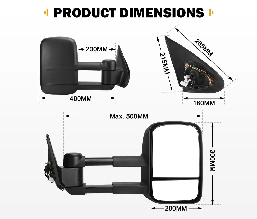 PACKAGE INCLUDES 2x Towing Mirrors WARRANTY 3 Years Warranty