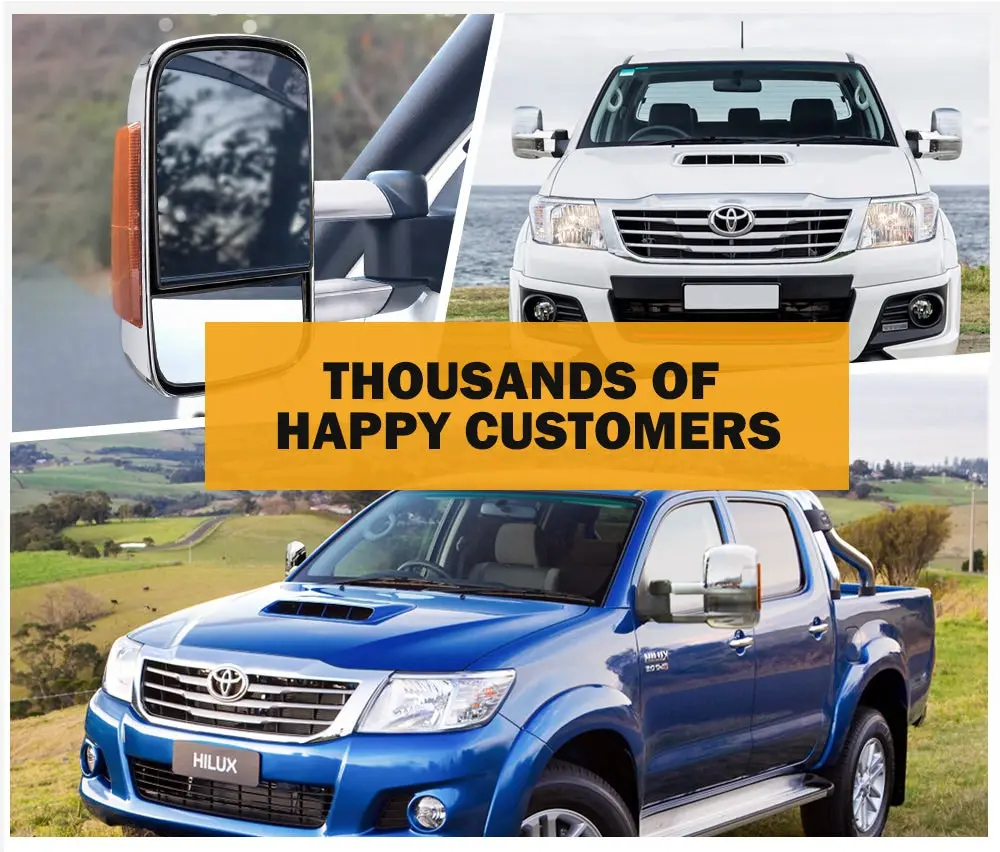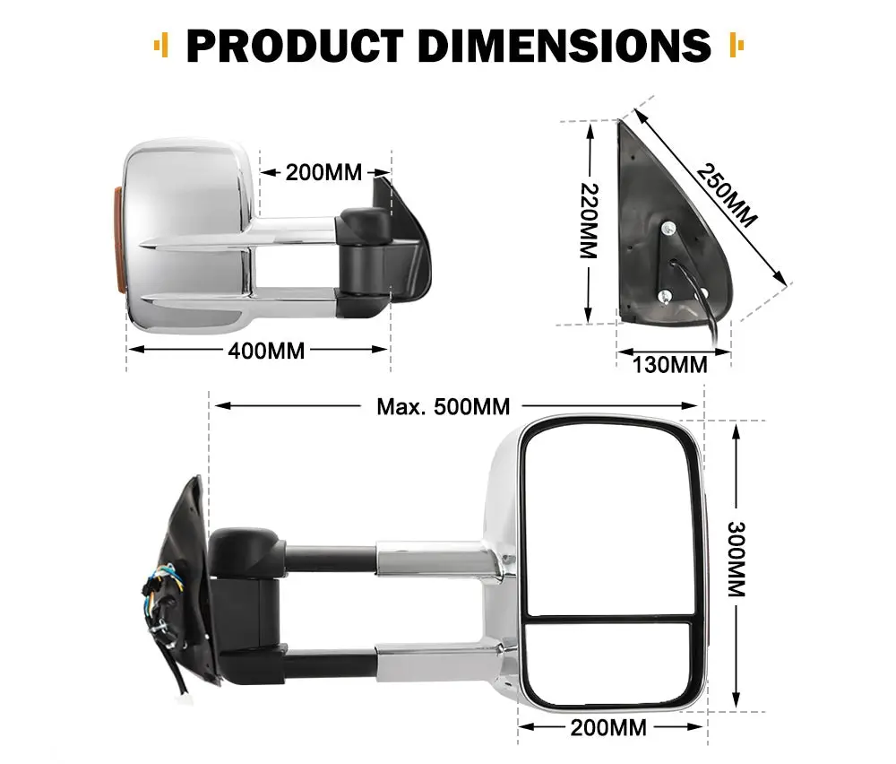 DESCRIPTION The consrtuction of the factory mirror sometimes does not take towing into consideration,and driver’s vision will,to a great extent,be blocked by the caravan at the rear.And this pair of towing mirror is our offering to your pains. The mirrors come as full replacements, and are supplied with plug and play wires for quick installation. We also incorporates two different surfaces to provide different but crucial visuals for your driving safety. The flat mirror is meant for regular driving, and the convex mirror, which is for broader vision to eliminate spots, allows you to have a clear view to the lanes. The mirror has an extension of 100mm, and can slide out a further 100mm when towing. It can also be adjusted to areas of concern, or folded to avoid potential damage. Made of ultra tough ABS, this mirror is therefore equipped with all-weather performance, and is fearless against any harsh road conditions.Chrome finish is not onl FEATURES OEM Fitment: This pair of towing mirror is precisely engineered for Toyota HILUX 2005-2015. Plug & Play: This towing mirror offered by us is supplied with plug and play wires for quick and easy installation. Solid Build: Made of sturdy ABS with chrome finish, the mirror is engineered for toughness to withstand any road conditions and harsh weather. Extendable Construction: Extendable construction guarantees this mirror a total of 200mm of wider extension compared with factory ones. Easy Adjustment: It can also be adjusted to the areas of blind spots, or manually folded inwards to prevent potential damage. Flat Mirror: It can provide driver an unobstructed view of the rear of the vehicle, both horizontally and vertically. Convex Mirror: It features a convex shape for enormous vision to eliminate blind spot, and can be adjusted manually. Less Distortion: The balanced design of the mirror aims to eliminate the distortion of the rear view. *NOTE: Indicators are required to be in Mirrors by law if you have pre-existing indicators in your OEM mirror. Minor adjustment is needed if OEMs don’t come with indicators. SPECIFICATIONS