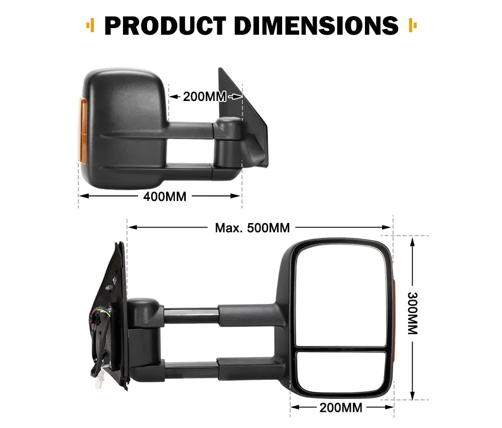 DESCRIPTION The consrtuction of the factory mirror sometimes does not take towing into consideration,and driver’s vision will,to a great extent,be blocked by the caravan at the rear.And this pair of towing mirror is our offering to your pains. The mirrors come as full replacements, and are supplied with plug and play wires for quick installation. We also incorporates two different surfaces to provide different but crucial visuals for your driving safety. The flat mirror is meant for regular driving, and the convex mirror, which is for broader vision to eliminate spots, allows you to have a clear view to the lanes. The mirror has an extension of 100mm, and can slide out a further 100mm when towing. It can also be adjusted to areas of concern, or folded to avoid potential damage. Made of ultra tough ABS, this mirror is therefore equipped with all-weather performance, and is fearless against any harsh road conditions. FEATURES OEM Fitment: This pair of towing mirror is precisely engineered for Toyota Landcruiser 200 Series 2007-2021. Plug & Play: This towing mirror offered by us is supplied with plug and play wires for quick and easy installation. Solid Build: Made of sturdy ABS, this injection moulded mirror is strong enough to withstand tough road conditions and harsh weather. Extendable Construction: Extendable construction guarantees this mirror a total of 200mm of wider extension compared with factory ones. Easy Adjustment: It can also be adjusted to the areas of blind spots, or manually folded inwards to prevent potential damage. Flat Mirror: It can provide driver an unobstructed view of the rear of the vehicle, both horizontally and vertically. Convex Mirror: It features a convex shape for enormous vision to eliminate blind spot, and can be adjusted manually. Less Distortion: The balanced design of the mirror aims to eliminate the distortion of the rear view. **NOTE: Not fit for landcuriser sahara series models. *NOTE: Indicators are required to be in Mirrors by law if you have pre-existing indicators in your OEM mirror. Minor adjustment is needed if OEMs don’t come with indicators. SPECIFICATIONS
