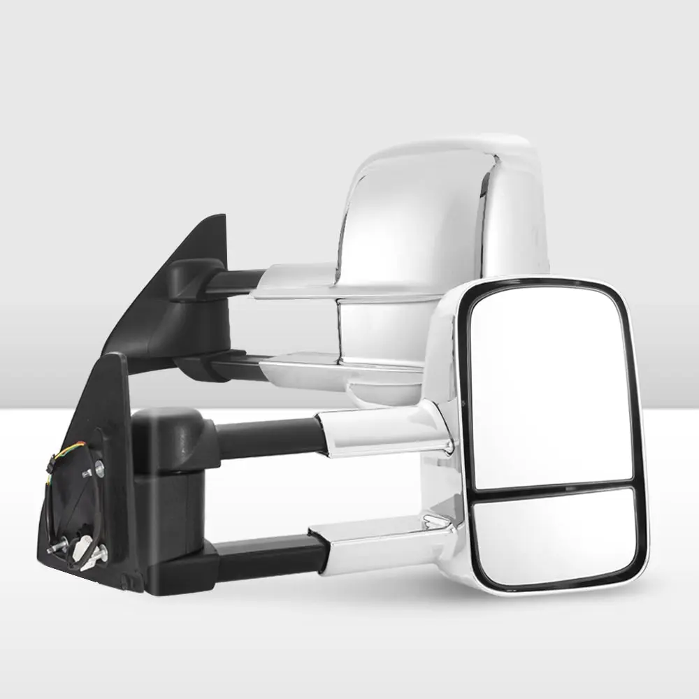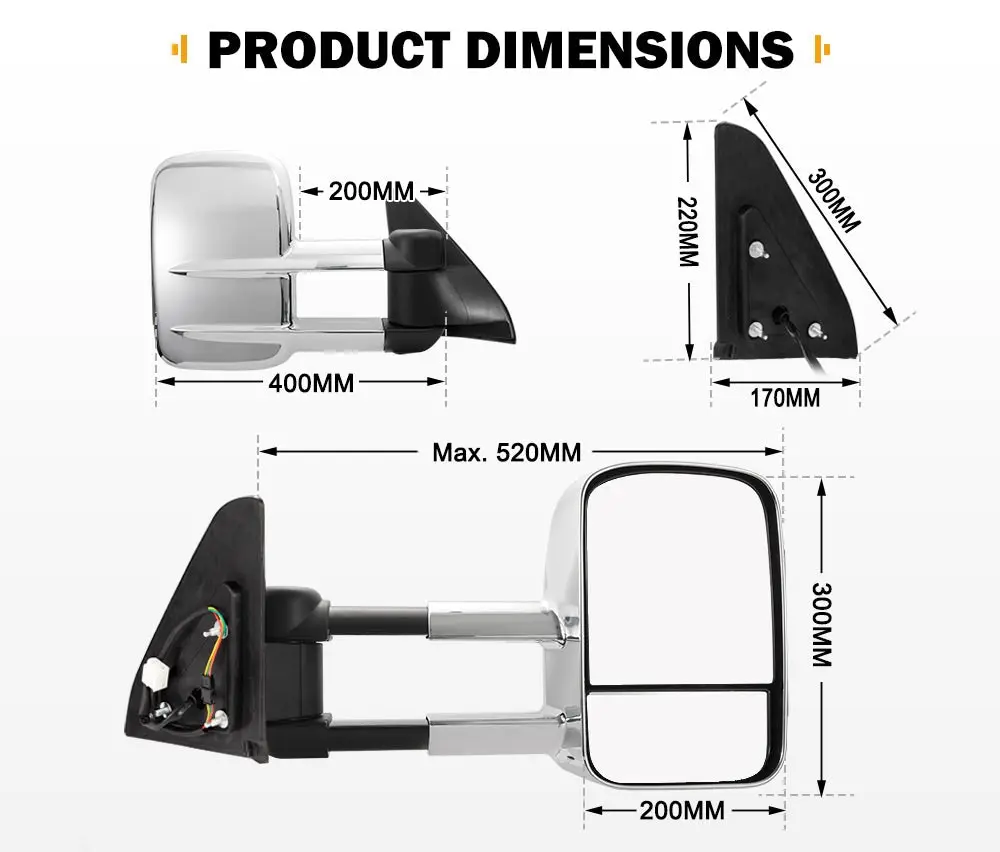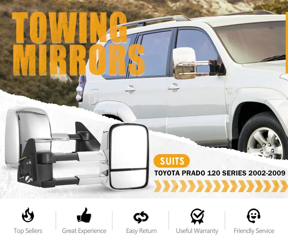 DESCRIPTION The consrtuction of the factory mirror sometimes does not take towing into consideration,and driver’s vision will,to a great extent,be blocked by the caravan at the rear.And this pair of towing mirror is our offering to your pains. The mirrors come as full replacements, and are supplied with plug and play wires for quick installation. We also incorporates two different surfaces to provide different but crucial visuals for your driving safety. The flat mirror is meant for regular driving, and the convex mirror, which is for broader vision to eliminate spots, allows you to have a clear view to the lanes. The mirror has an extension of 100mm, and can slide out a further 100mm when towing. It can also be adjusted to areas of concern, or folded to avoid potential damage. Made of ultra tough ABS, this mirror is therefore equipped with all-weather performance, and is fearless against any harsh road conditions.Chrome FEATURES OEM Fitment: This pair of towing mirror is precisely engineered for Toyota Prado 120 Series 2002-2009. Plug & Play: This towing mirror offered by us is supplied with plug and play wires for quick and easy installation. Solid Build: Made of sturdy ABS with chrome finish, the mirror is engineered for toughness to withstand any road conditions and harsh weather. Extendable Construction: Extendable construction guarantees this mirror a total of 200mm of wider extension compared with factory ones. Easy Adjustment: It can also be adjusted to the areas of blind spots, or manually folded inwards to prevent potential damage. Flat Mirror: It can provide driver an unobstructed view of the rear of the vehicle, both horizontally and vertically. Convex Mirror: It features a convex shape for enormous vision to eliminate blind spot, and can be adjusted manually. Less Distortion: The balanced design of the mirror aims to eliminate the distortion of the rear view. SPECIFICATIONS