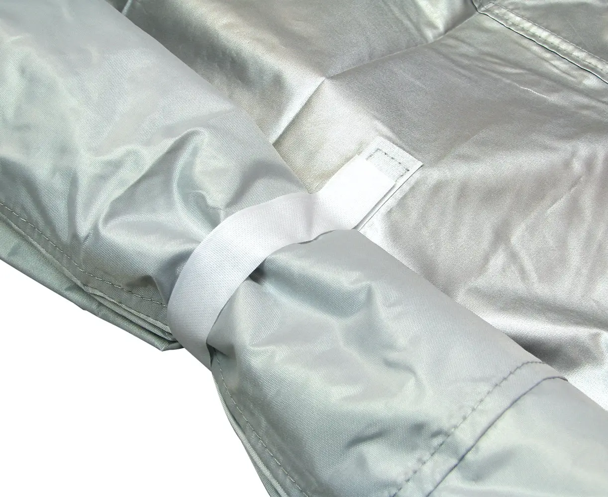 These covers are designed to be easily fitted with elastic hems around the front and rear as well as adjustable straps which pass under the body from side to side. The straps are adjustable (to around 2.8m) and have quick-release / fitting clips to make securing the cover quick and easy.
